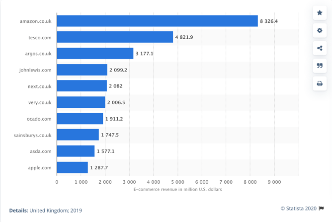 Statista. (2019). Most popular online stores in the United Kingdom in 2018, by e-commerce net sales (in Million U.S. Dollar). Retrieved from Statista.