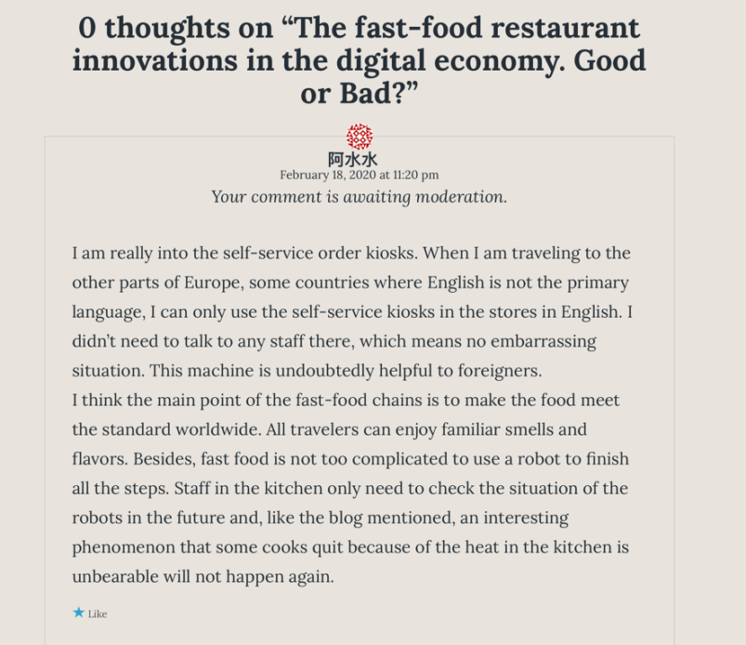 I chose the audio tour guide and guided robots as the topic of my first blog. I was attracted by this theme when I learned the MOOC about eye-tracking at home, which inspired me about lots of thoughts about the future development of tour guides and improving the experience of tourists in different scenes. By the way, flexible time of class is working on me, which allows me to stop at any time when I want to think twice or do some further research. The process of finishing the blog is the right way for me to explore and learn something new because I need to share it with my peers, which makes me more cautious and careful to choose what to share and write. I hope my content will be valuable and meaningful to those who spend their time reading.